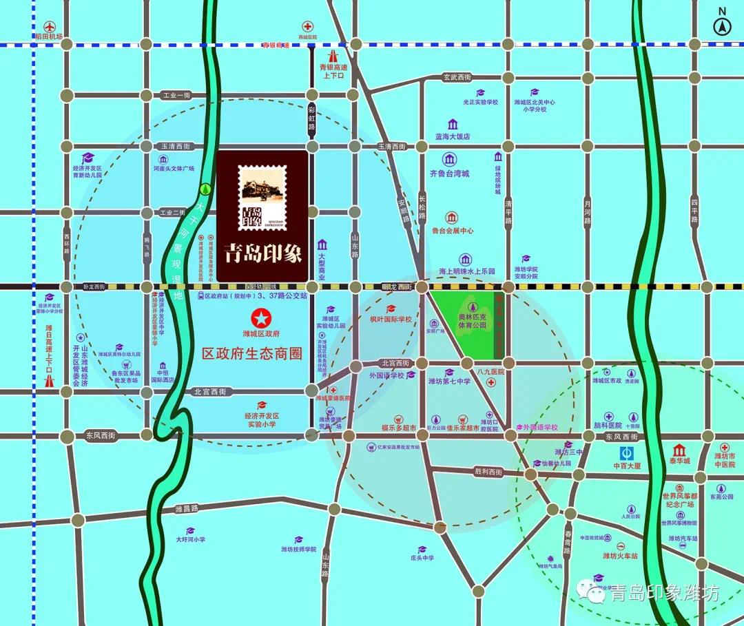 随着大于河两岸湿地的环境整治,重点项目招商引进,在潍城区政府周边打造滨水彩虹中央商务区,以高层楼宇建设为主体,布局金融保险、酒店娱乐、科技信息、商务服务等高端业态。