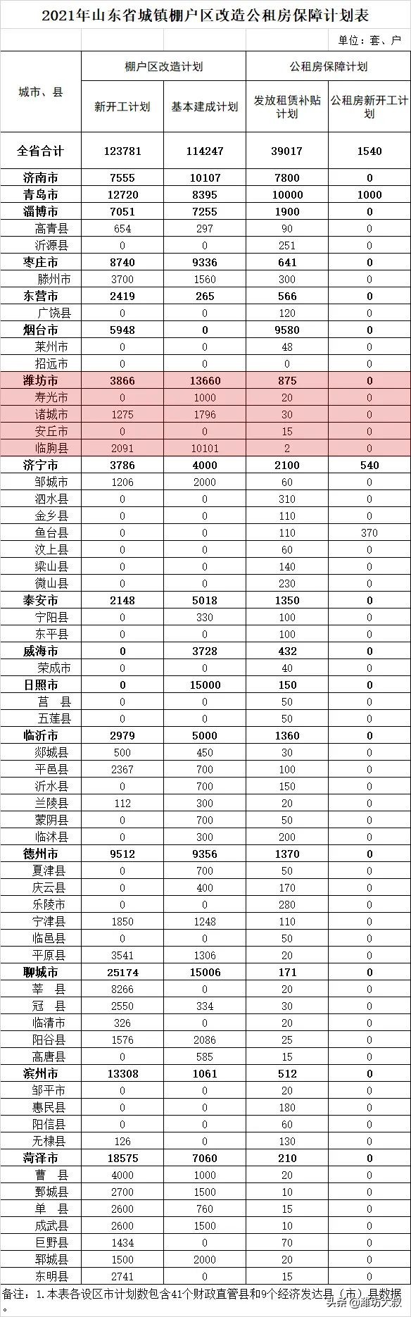近日,2021年山东省城镇棚户区改造公租房保障计划表公布,潍坊市计划新开工3866套。